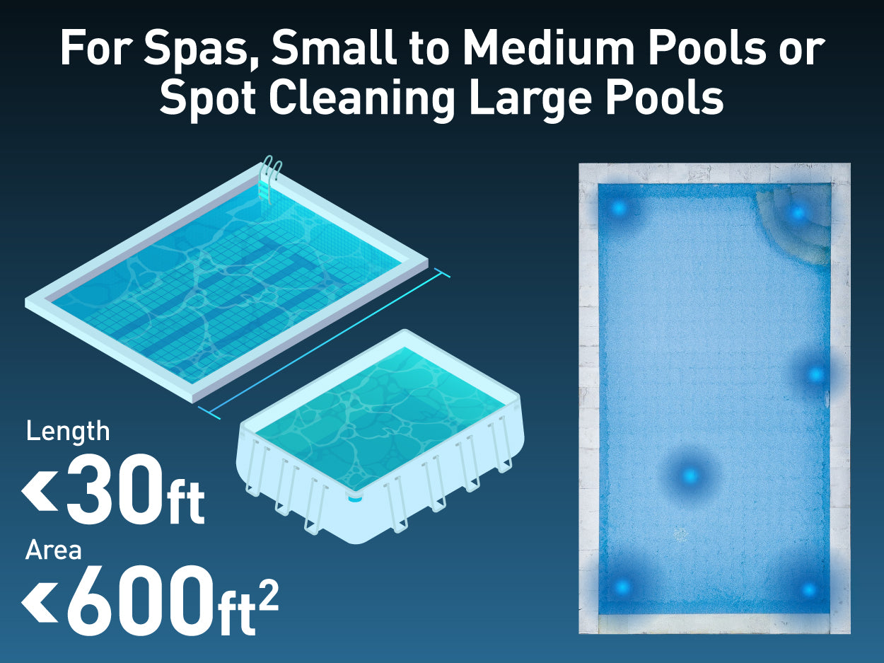 It is recommended to use in small pools, spas & spot cleaning up to 15ft in total area.