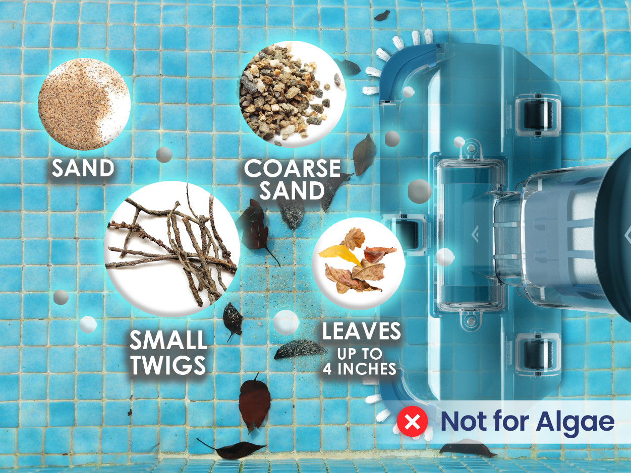 No, the vacuum is for daily maintenance to collect debris on the pool floor, such as leaves, sand, and dead bugs. It can catch some algae in the process but is not designed for it. To clean algae properly, you must use chemicals and shock your pool. Please ask your pool professional for more details on how to remove algae.